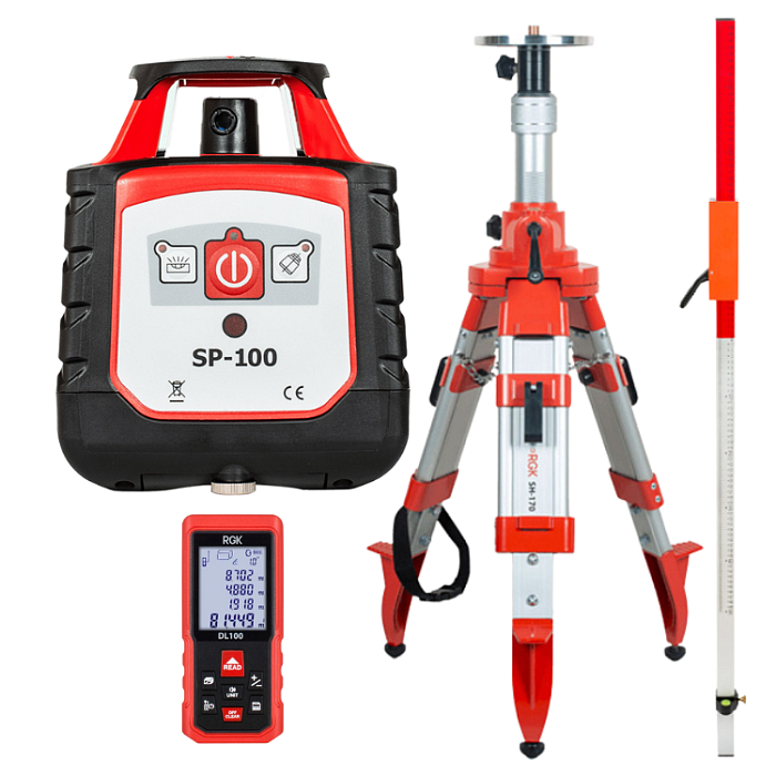 Комплект ротационный нивелир RGK SP-100 со штативом RGK SH-170, рейкой RGK LR-2 и лазерным дальномером RGK DL100