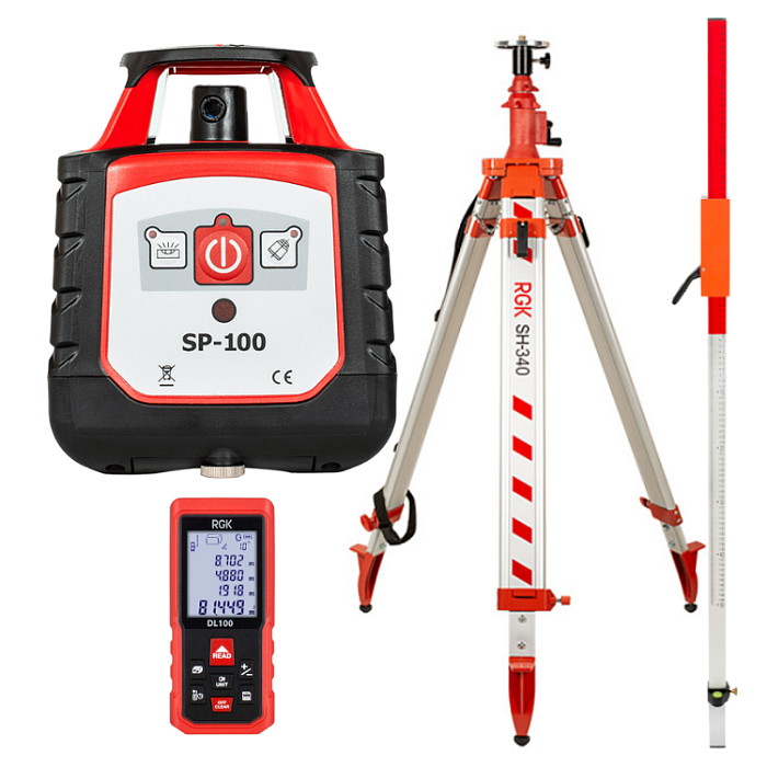 Комплект ротационный нивелир RGK SP-100 со штативом RGK SH-340, рейкой RGK LR-2 и лазерным дальномером RGK DL100