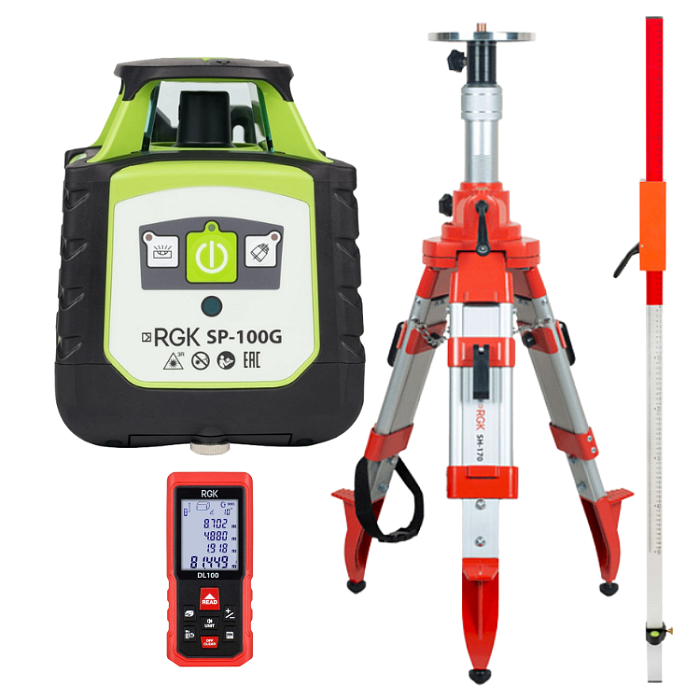 Купить комплект ротационный нивелир RGK SP-100G со штативом RGK SH-170, рейкой RGK LR-2 и лазерным дальномером RGK DL100