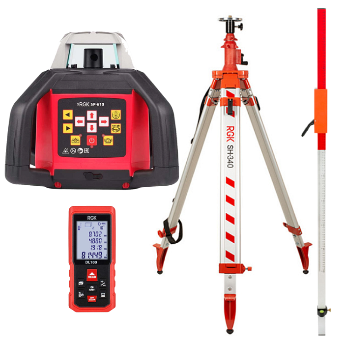 Купить комплект ротационный нивелир RGK SP-610 со штативом RGK SH-340, рейкой RGK LR-2 и лазерным дальномером RGK DL100