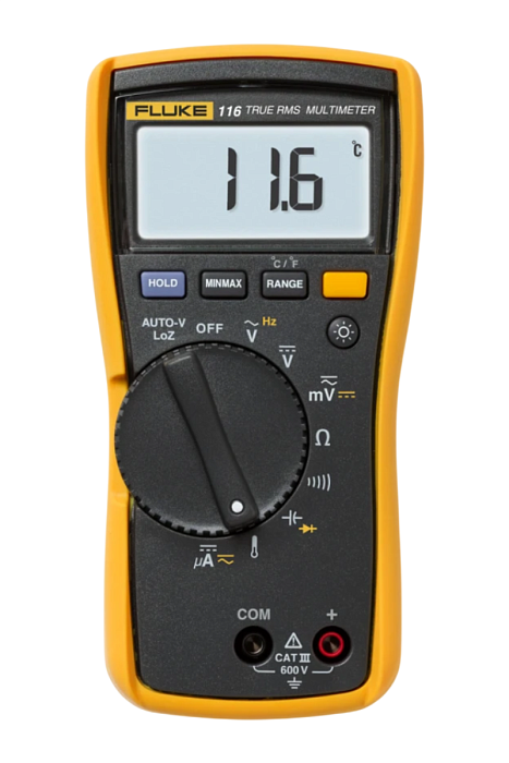Так как мультиметр Fluke 116 относится к ампервольтметрам True-RMS класса и определяет истинное среднеквадратическое значение переменного тока и напряжения, с его помощью вы можете выполнять высокоточные измерения в системах с нелинейными нагрузками, например, приводами компрессоров, и частотными помехами.