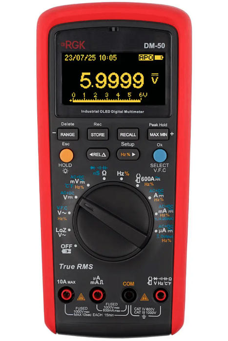 Мультиметр цифровой RGK DM-50 - промышленный прибор класса True RMS, надежное и безопасное решение для специалистов-электротехников, работающих с производственным оборудованием, электроустановками и сетями. Широкий функционал также делает эту модель подходящим выбором для сервисных центров по ремонту электроники.