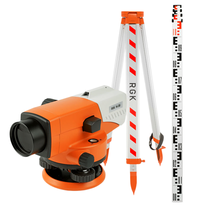 Оптический нивелир RGK N-38 со штативом RGK S6-N и рейкой RGK TS-4 – комплект измерительных приборов, предназначенный для нивелирования III класса, геодезических, маркшейдерских, строительных и прочих изысканий.