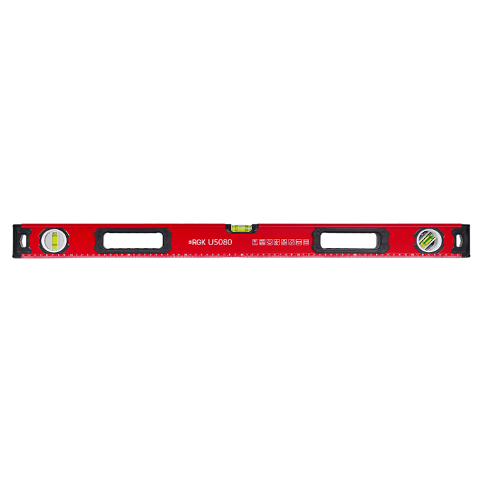 Пузырьковый уровень RGK U5080 длиной 80 сантиметров оснащен двумя магнитами на противоположных сторонах для крепления уровня на металлической поверхности, чтобы освободить руки при проведении разметки. Компактный размер позволяет носить уровень на поясе или хранить его в ящике для инструментов.