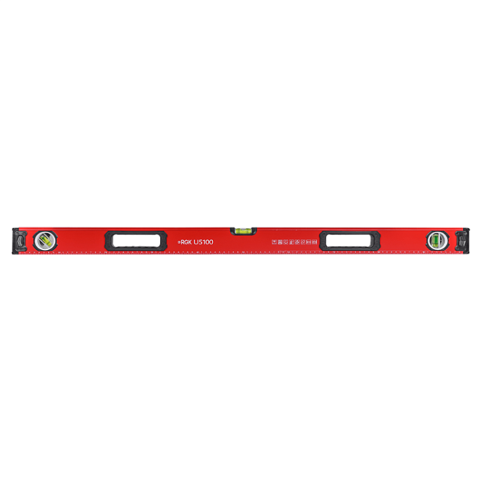 Линейка с ценой деления шкалы 1 мм поможет при разметке поверхностей. Засечки и подписи белого цвета на пузырьковом уровне RGK U5100 выполнены методом гравировки. Они не подвержены истиранию от частого контакта с такими поверхностями, как бетон или дерево.