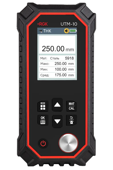 Предусмотрена возможность замены комплектного датчика на опциональные дополнительные зонды с другим частотным диапазоном, а также на сенсор в жаропрочном исполнении, предназначенный для проверки геометрии отливок, поковок и других изделий с высокой степенью нагрева. Для повышения точности при контроле геометрических параметров толщиномер RGK UTM-10 реализует функцию предварительного определения скорости распространения УЗ колебаний в конкретном материале. Данные можно сохранять для 3 пользовательских вариантов в настроечной таблице и использовать в ходе дальнейших измерений толщины. Инструмент запитывается от 3 батарей популярного типоразмера AA, что обеспечивает возможность выполнения измерений в любом месте.